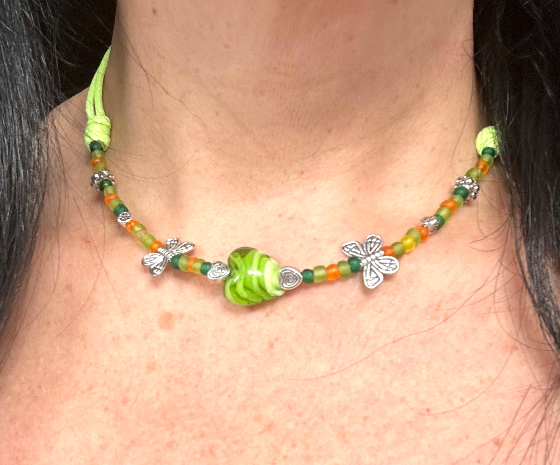 Bello y delicado collar ajustable, muy juvenil,ideal para la playa y el verano. Elaborado con hilo de piel de serpiente, cristales, piezas con baño de plata y corazón de arte Murano.