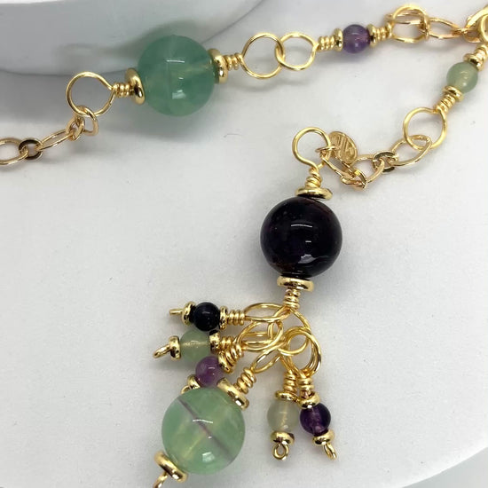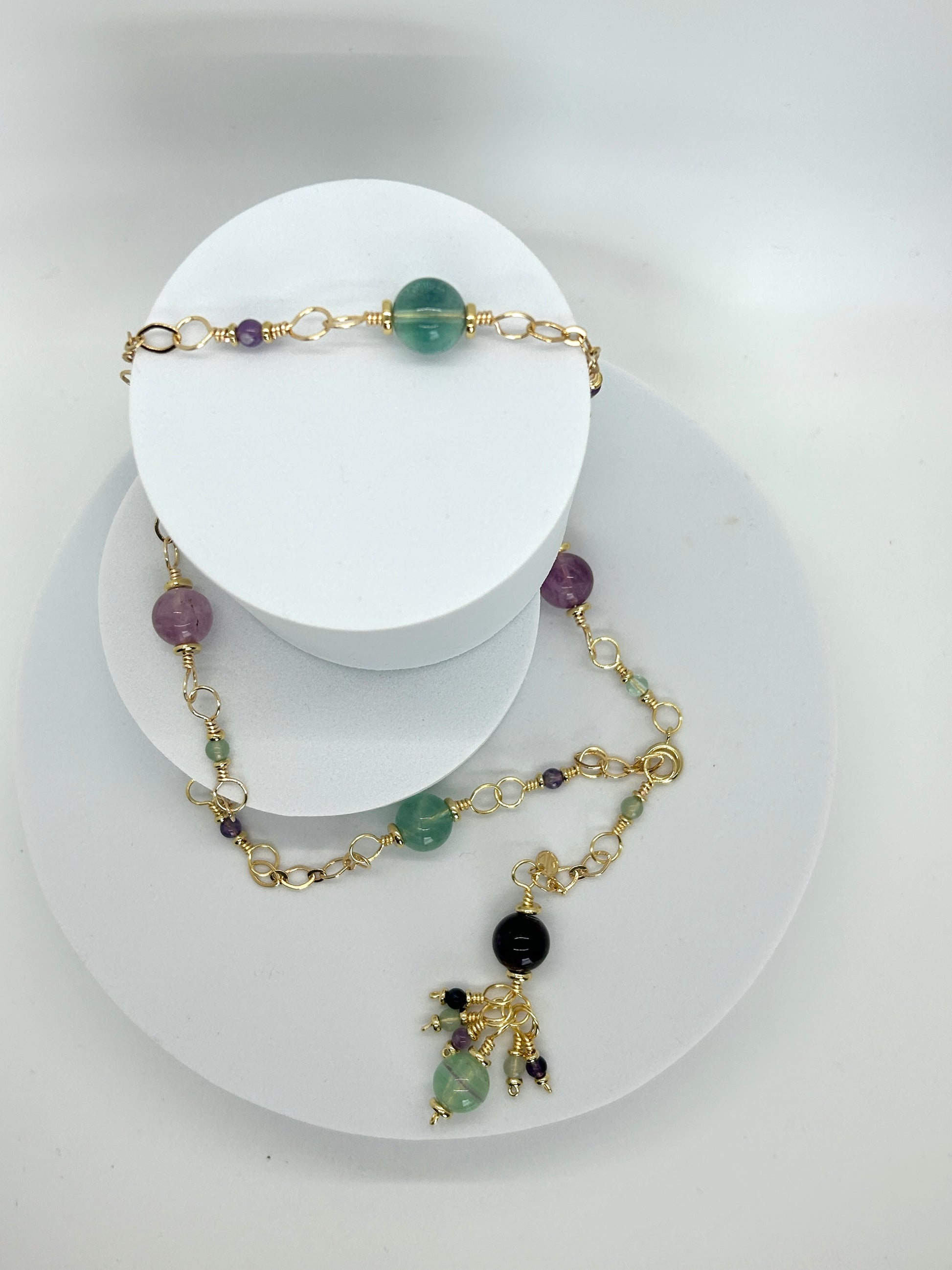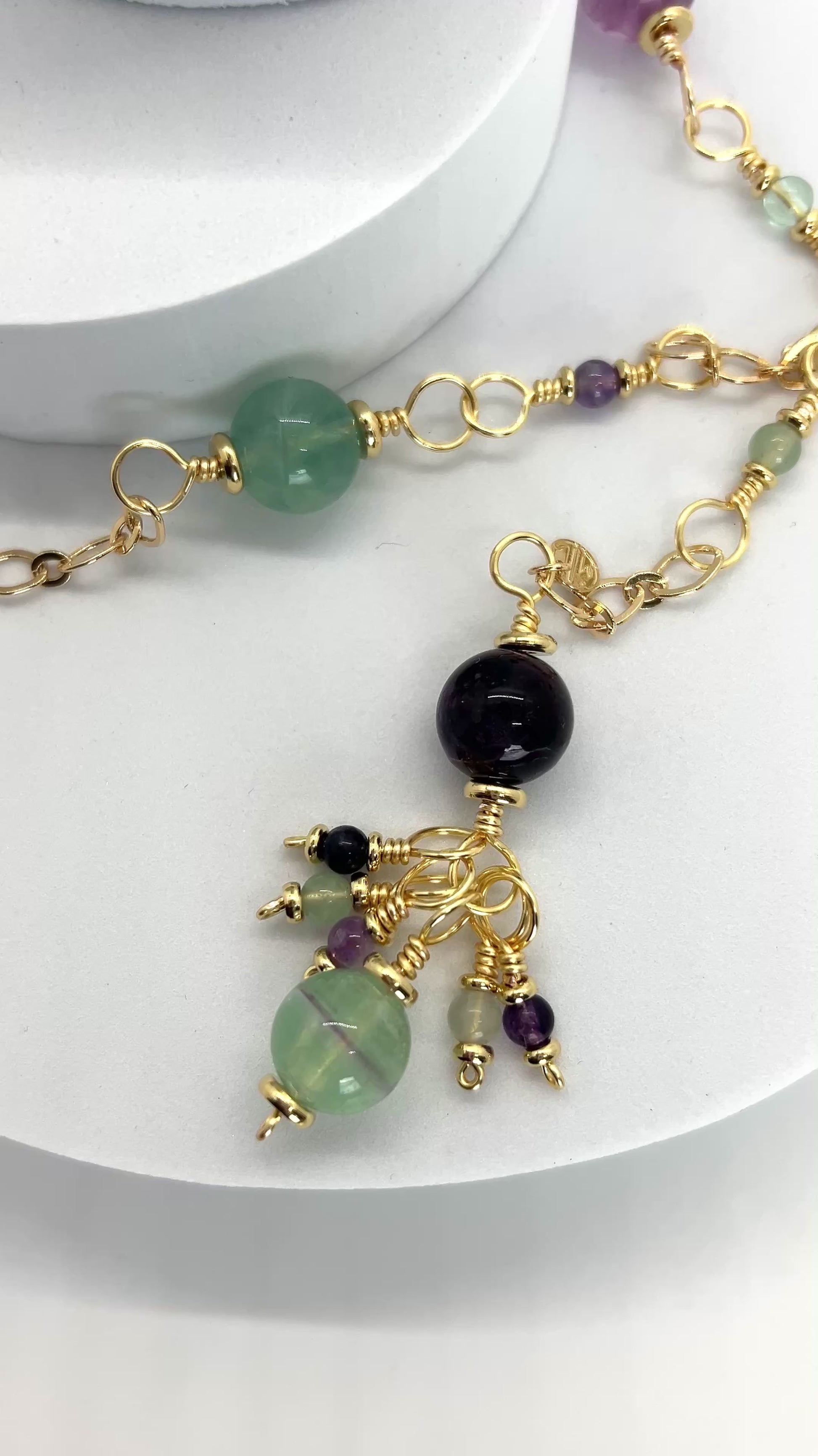Bello y elegante collar elaborado con piedras naturales de Fluorita y Amatistas, engastadas en hilo, cadena y piezas de gold plated AAA hipoalergénico. Pieza única de la colección "Sofia Boreal"