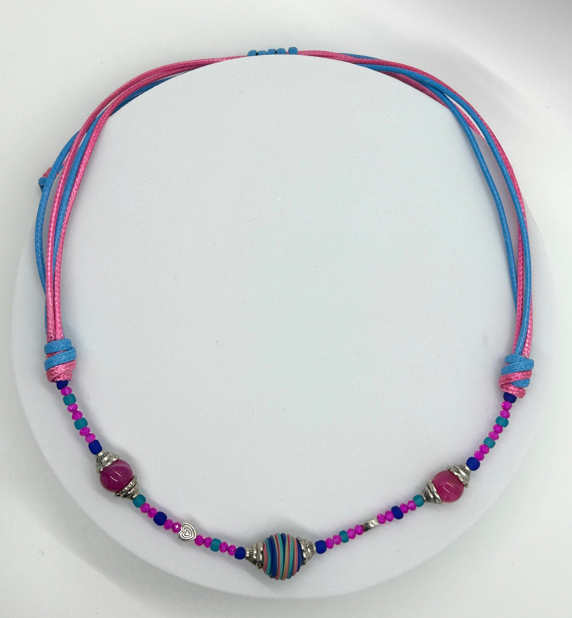 Bello y delicado collar ajustable, muy juvenil,ideal para la playa y el verano. Elaborado con hilo de piel de serpiente, cristales, piezas con baño de plata, cuenta de madera pintada a mano y ágatas magenta rayadas.