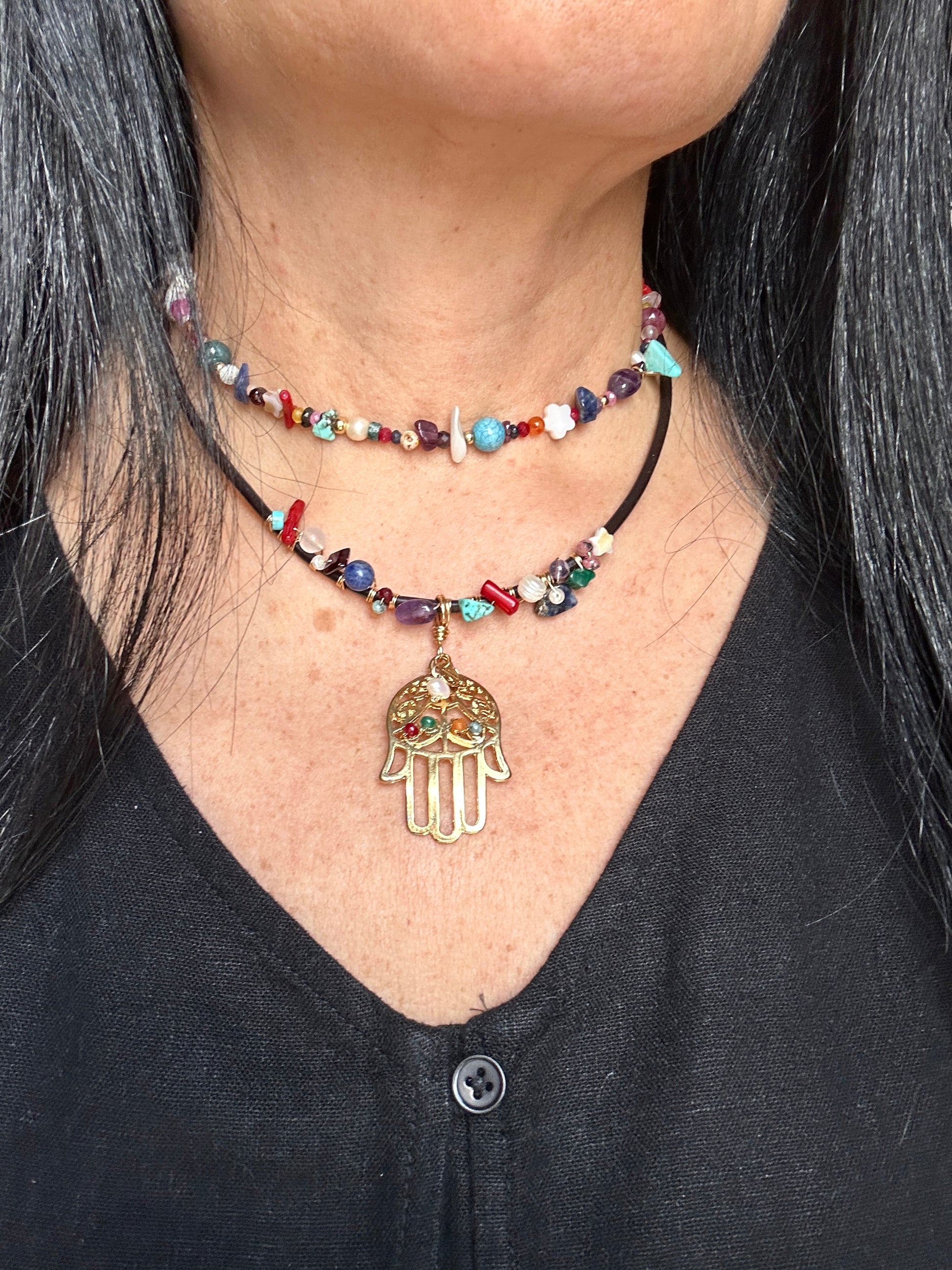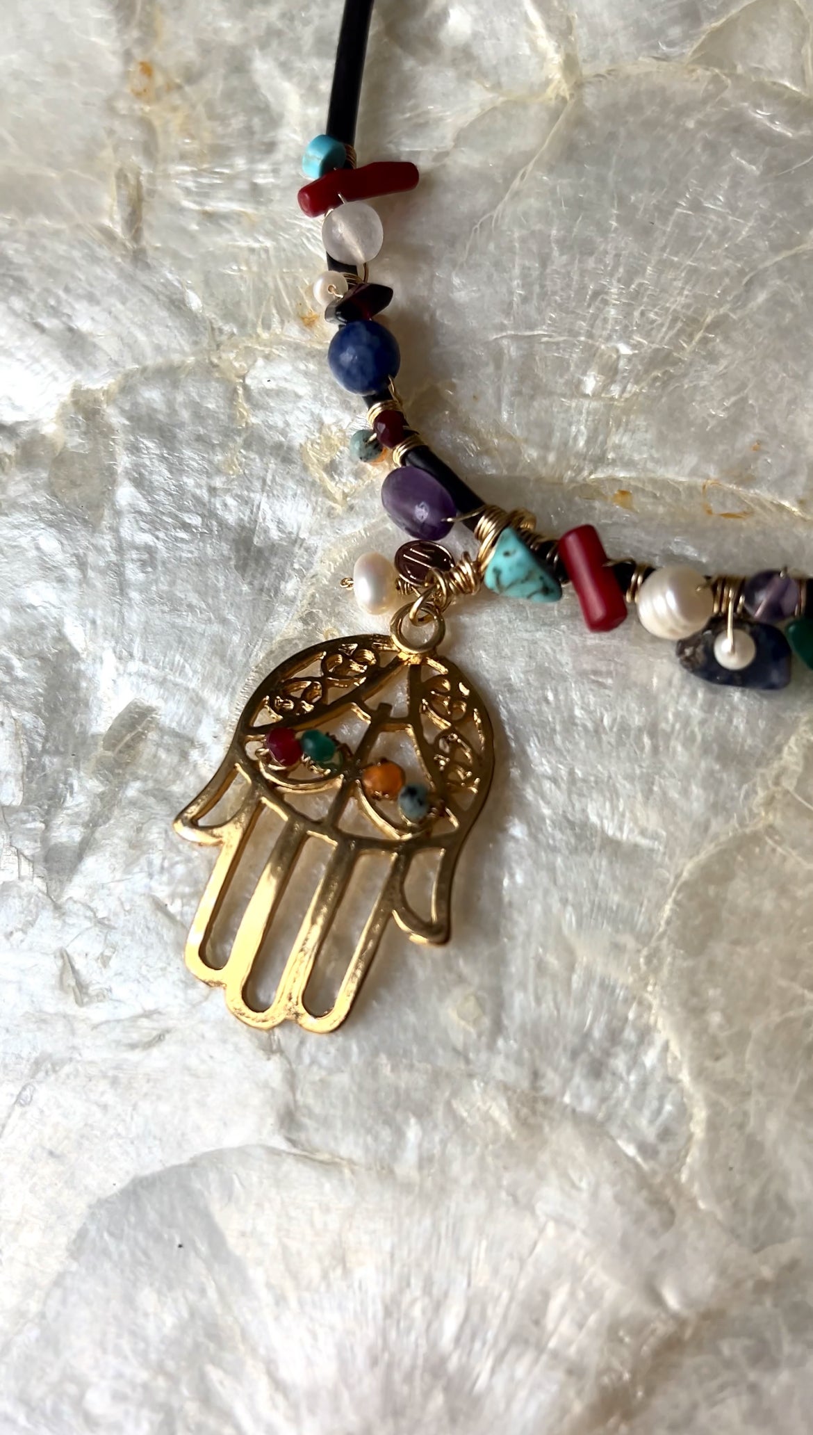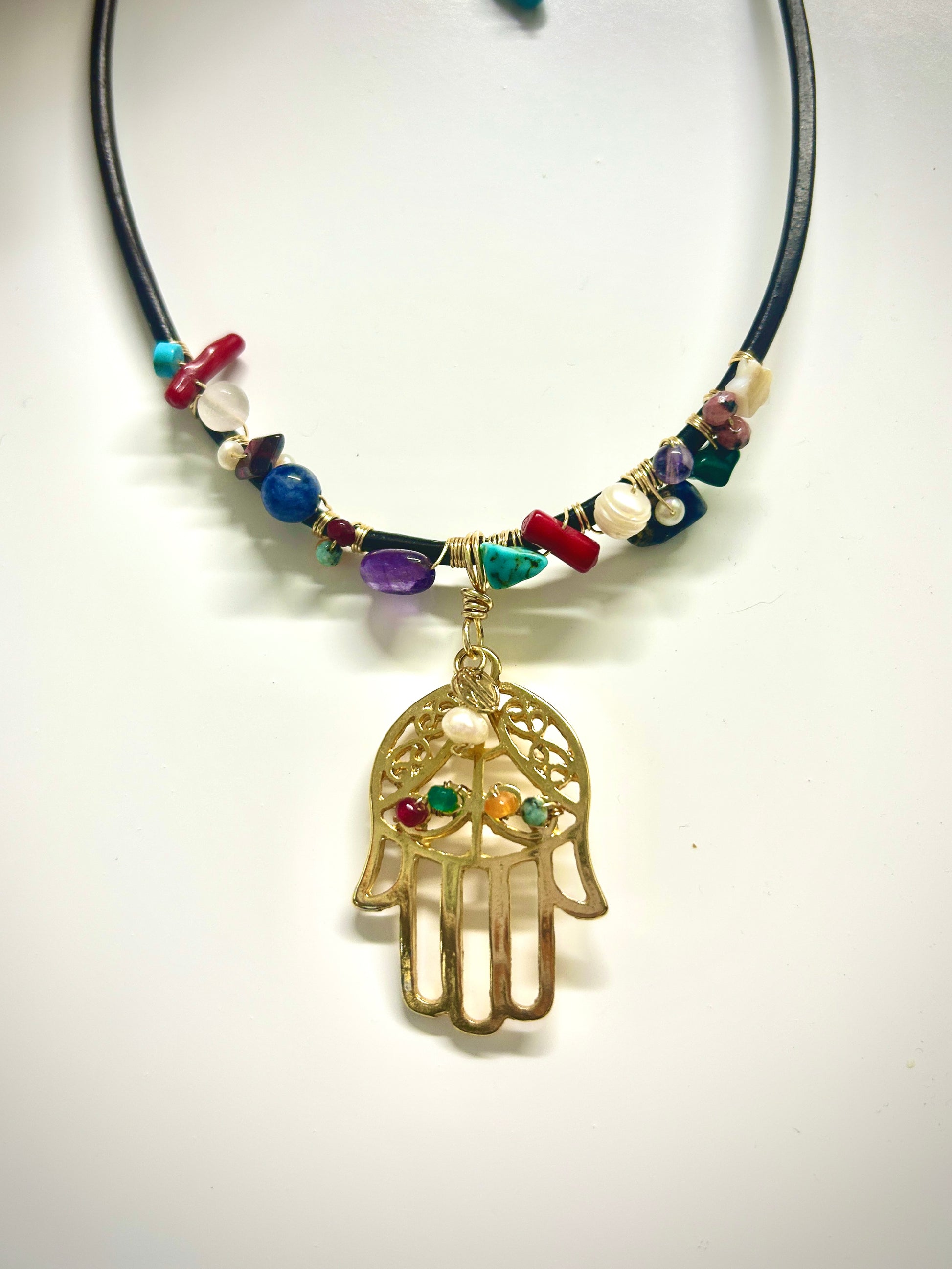 Bella y moderna gargantilla, elaborada con cuero de 3mm, piedras naturales de cuarzo cristal, ágatas, amatistas, turquesas, lapislázuli, perlas, corales, nacar, granates y malaquita. Hilo, extensión de cadena y dije principal de "Mano Hamsa", de gold plated AAA hipoalergénico.