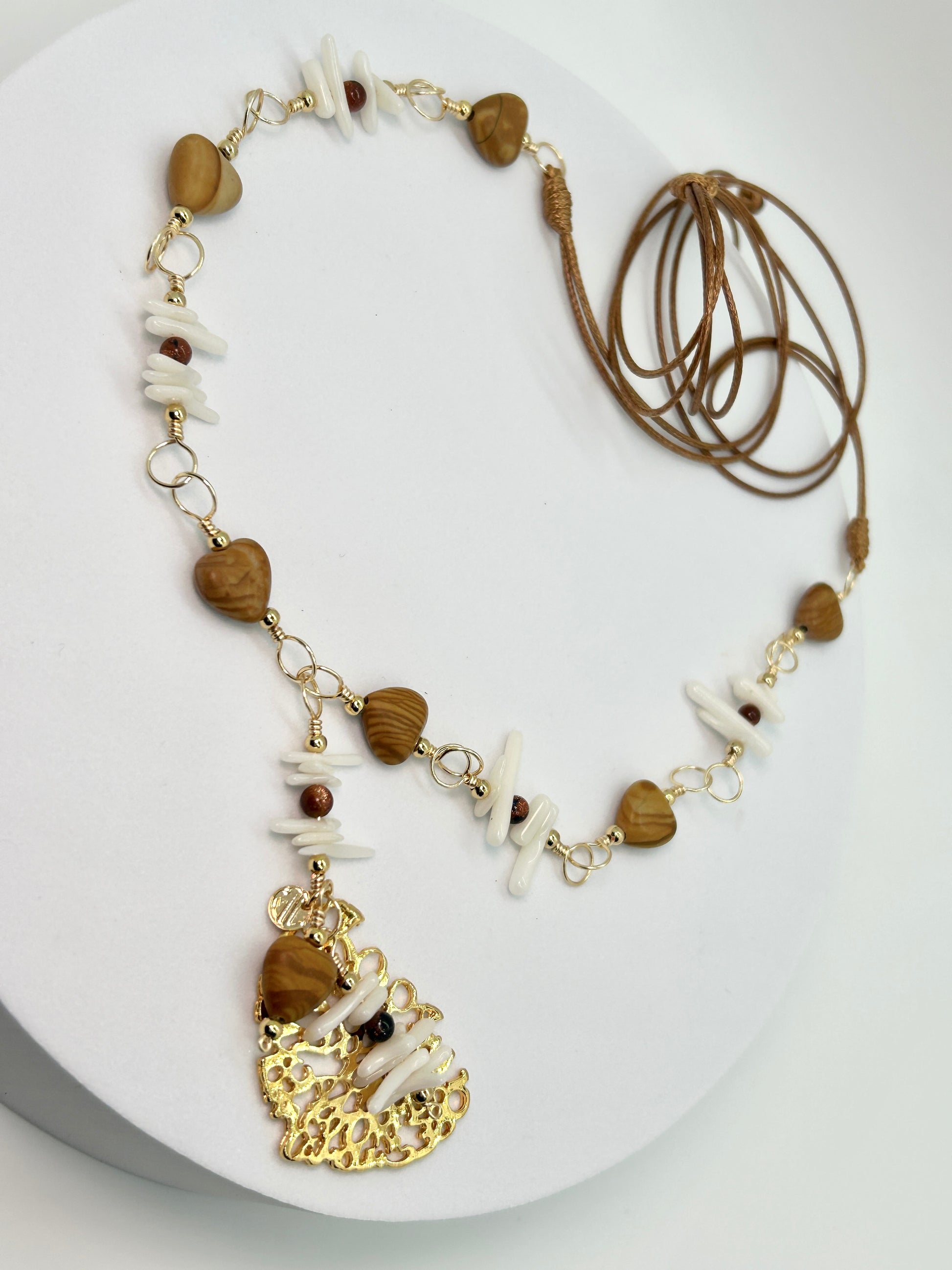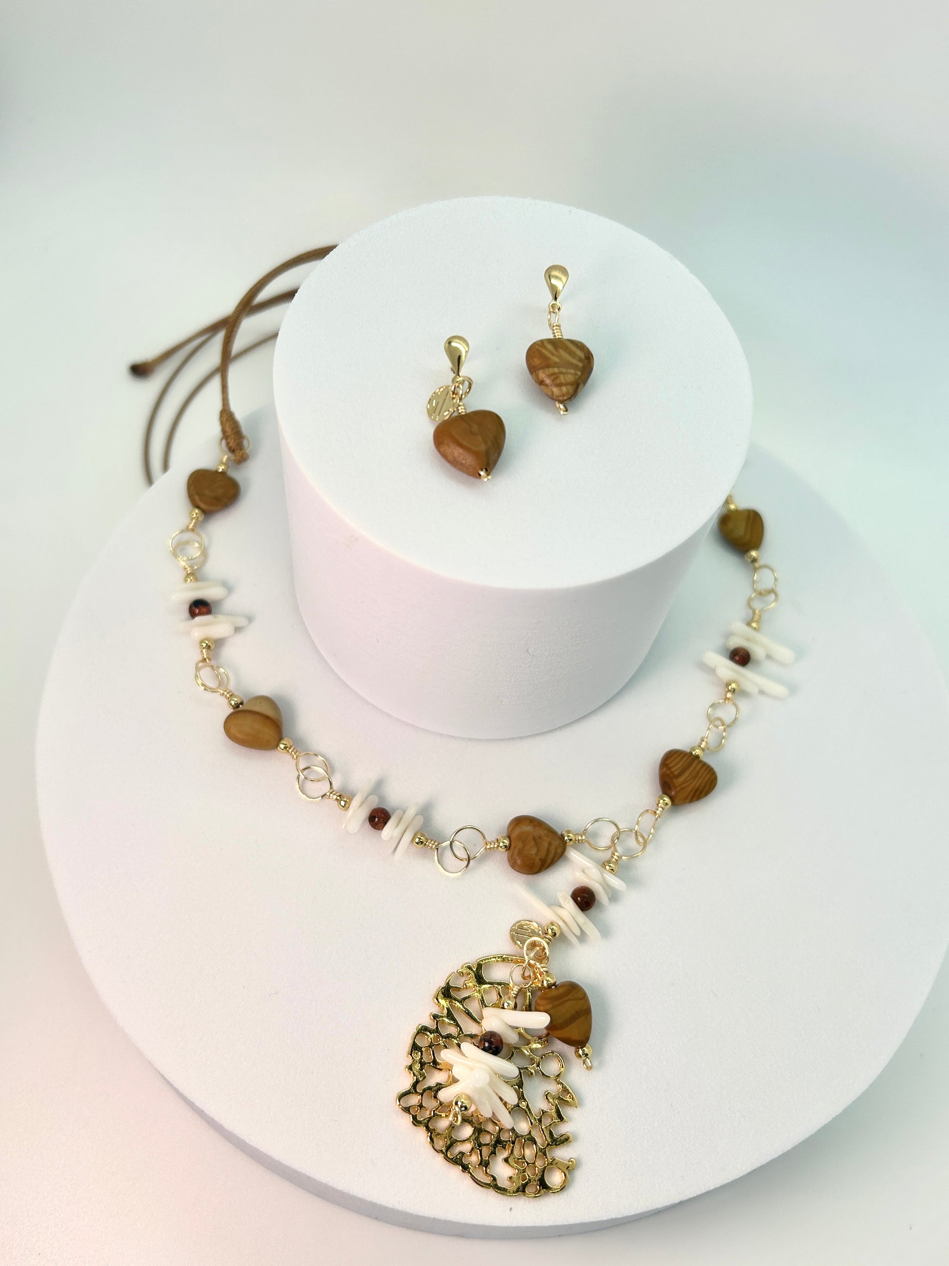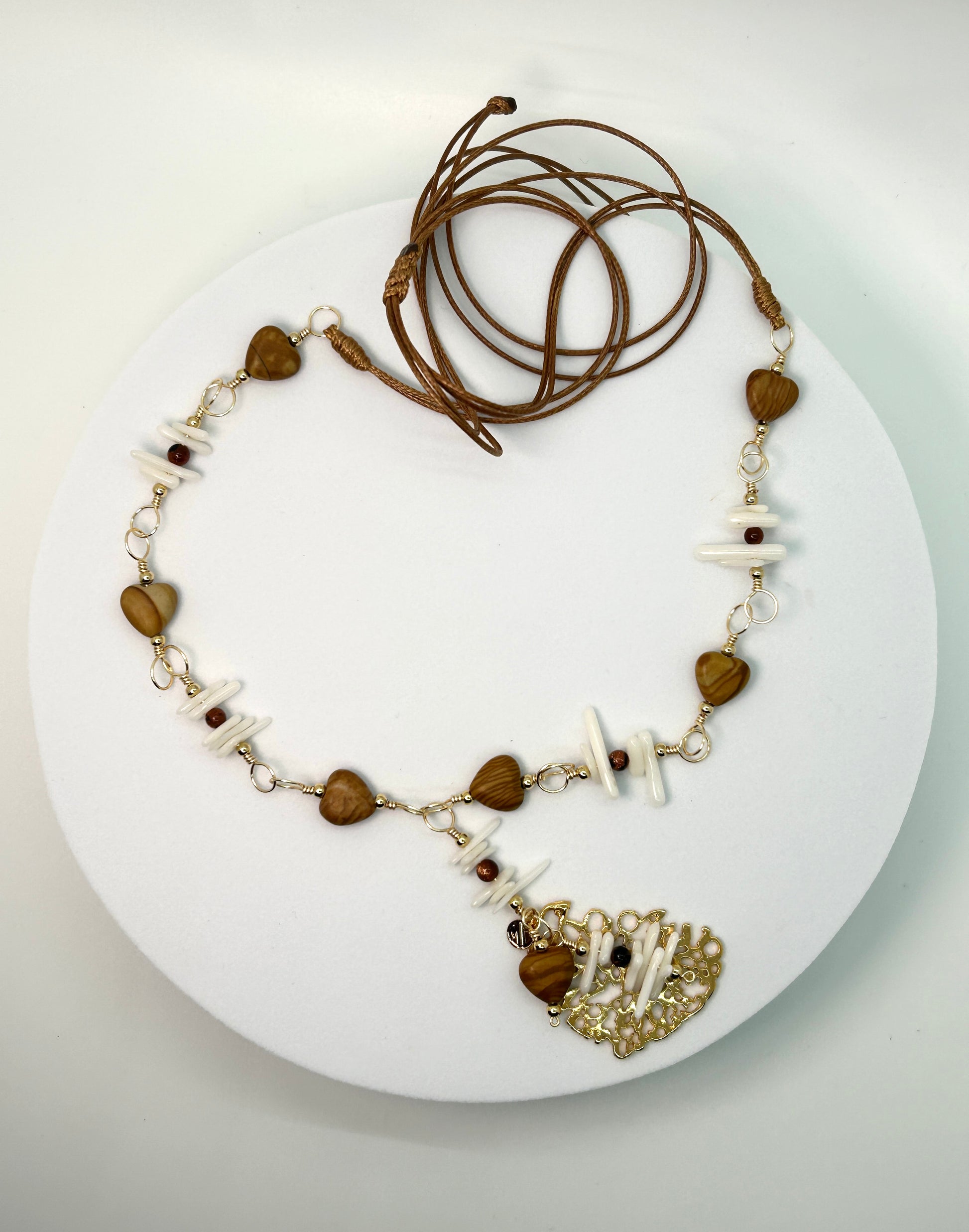 Exquisito collar ajustable, elaborado con hilo de piel de culebra, con bellos corazones de "Jaspe Madera Amarillo", piedras naturales de ojo de dije de tigre, corales blancos y dije de corazón e hilo de gold plated 18k AAA.