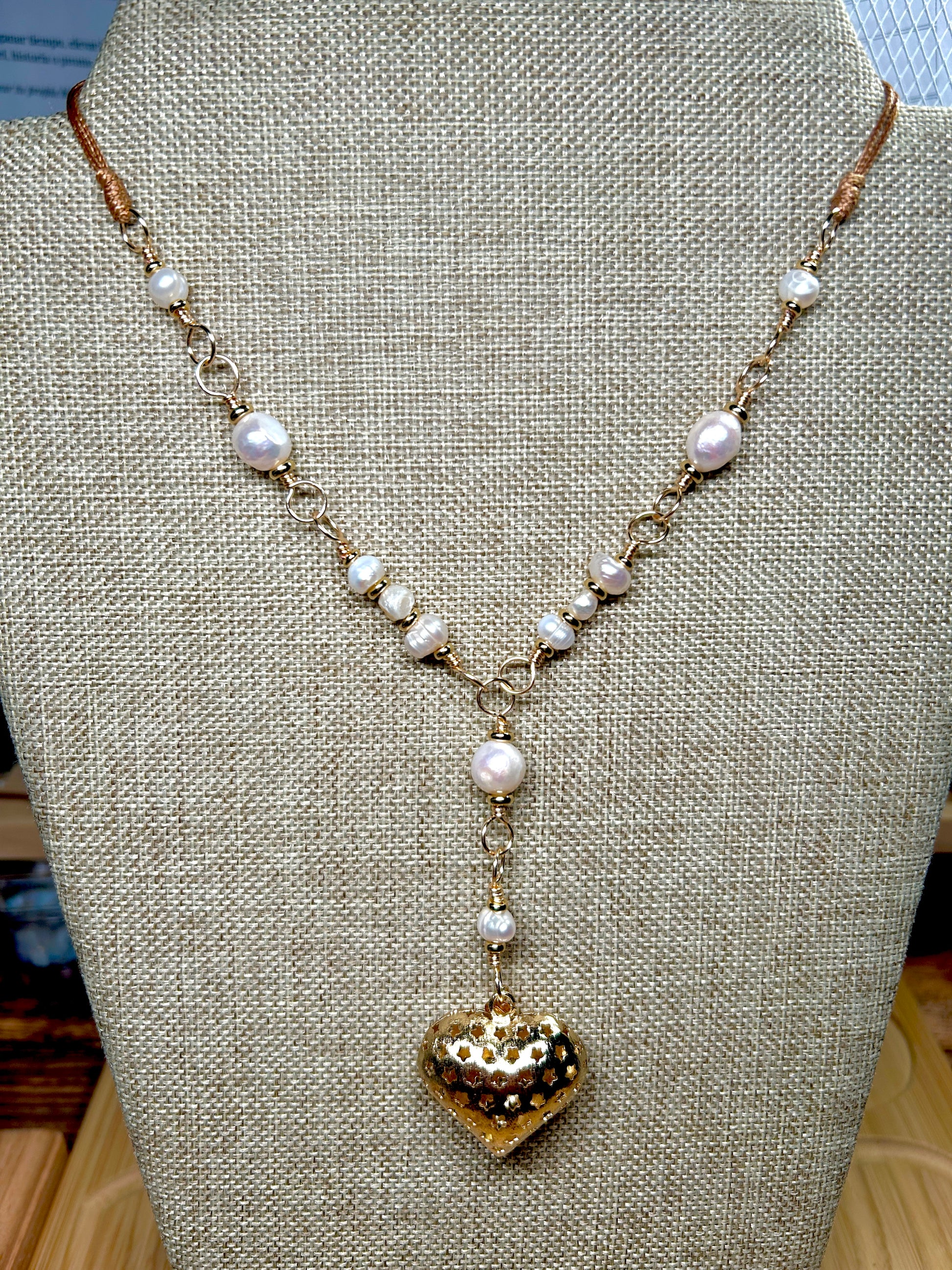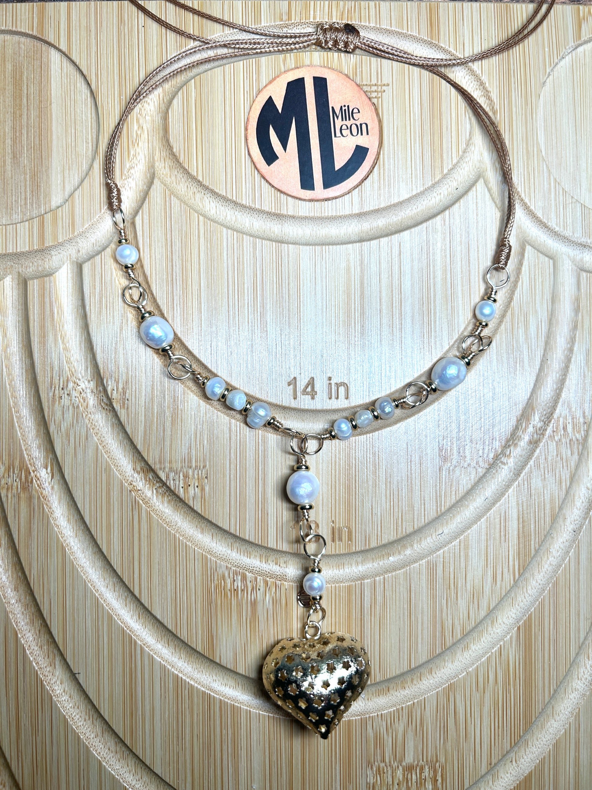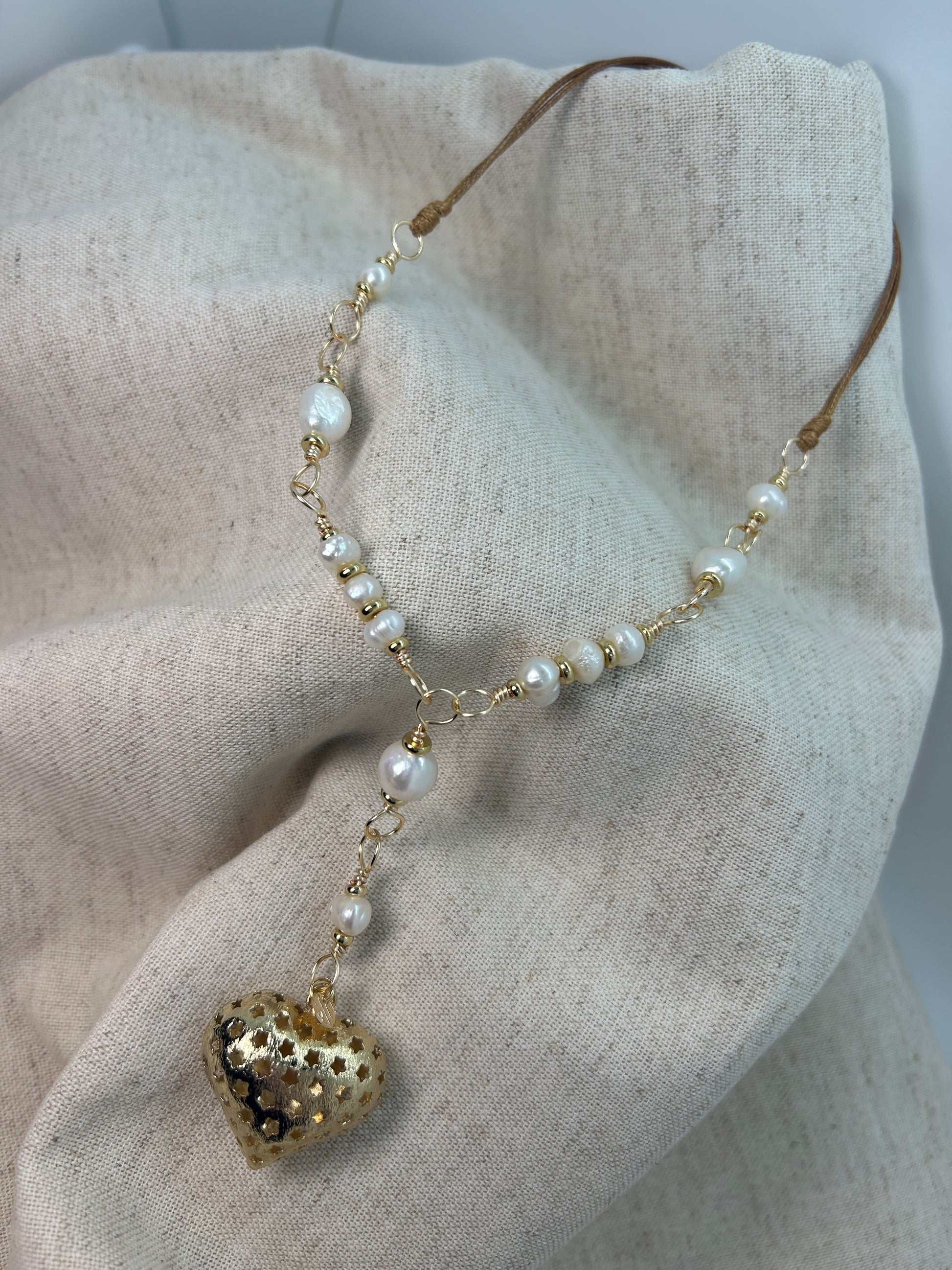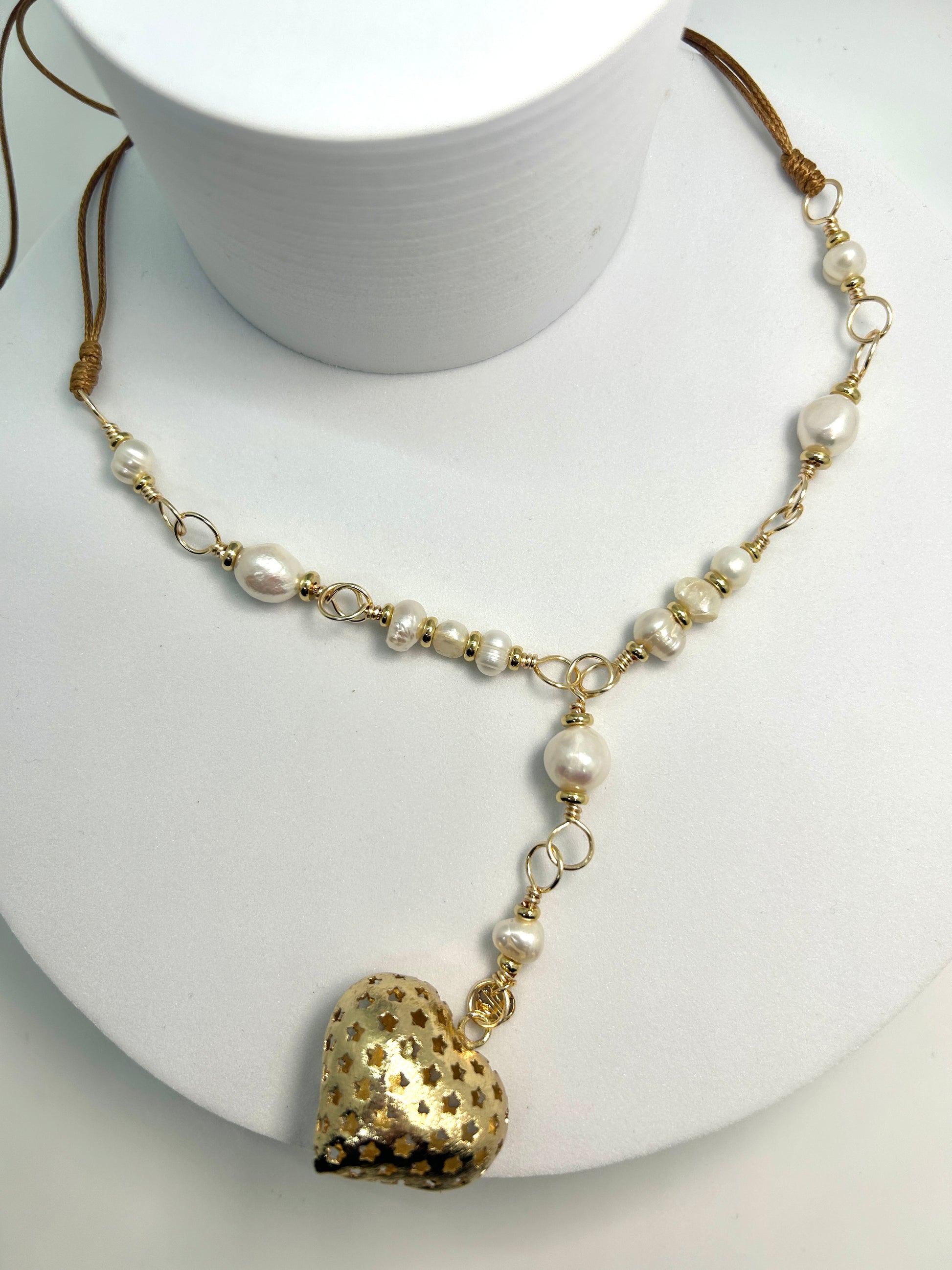 Collar delicado, elegante y versátil, elaborado con hilo de piel de serpiente, alambre de gold plated AAA 18K hipoalergénico y perlas cultivadas. Ajustable
