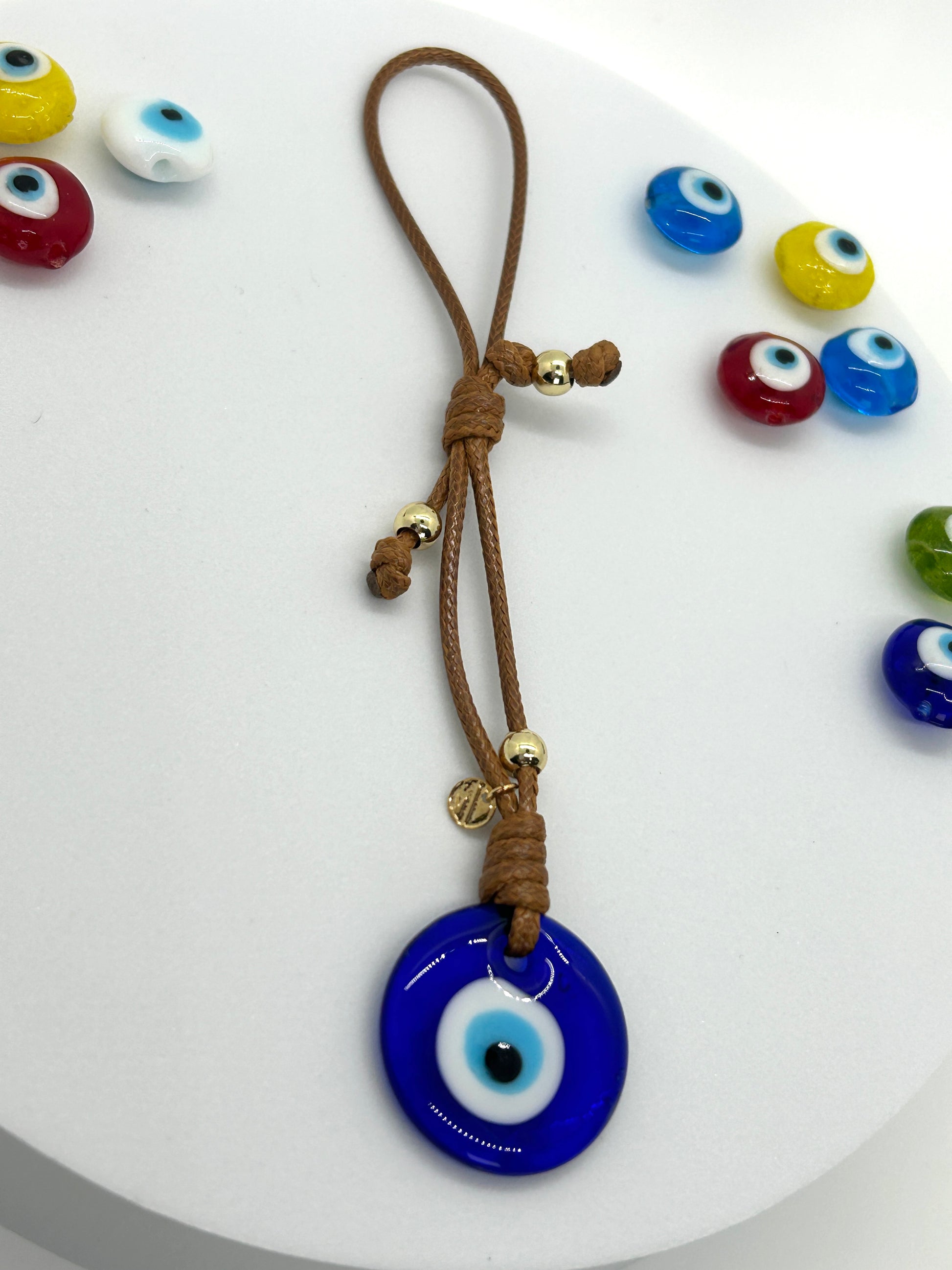 Bello llavero de ojo turco de Murano, piezas de gold plated AAA e hilo de piel de serpiente. Suerte y protección para potenciar tu outfit.
