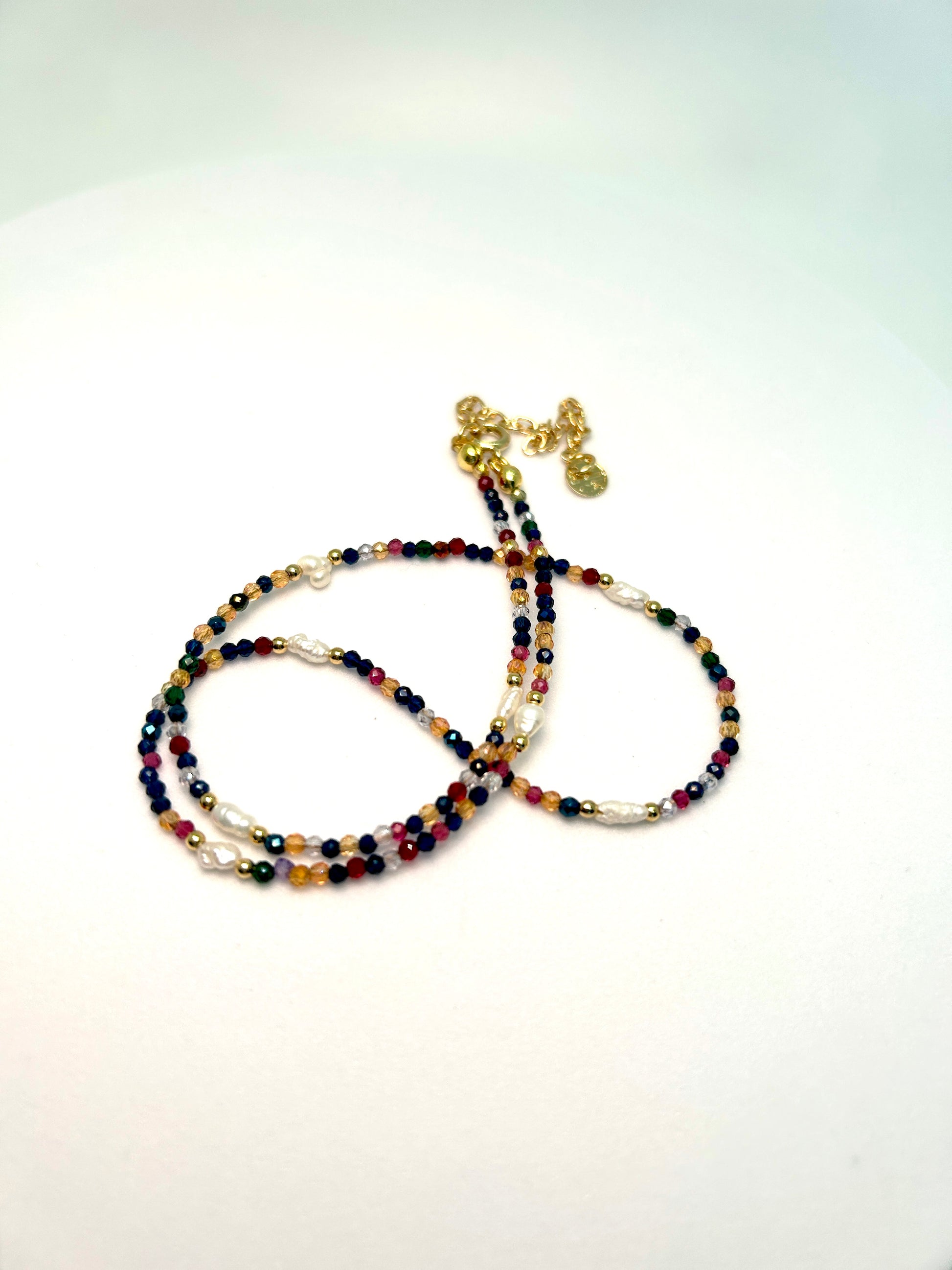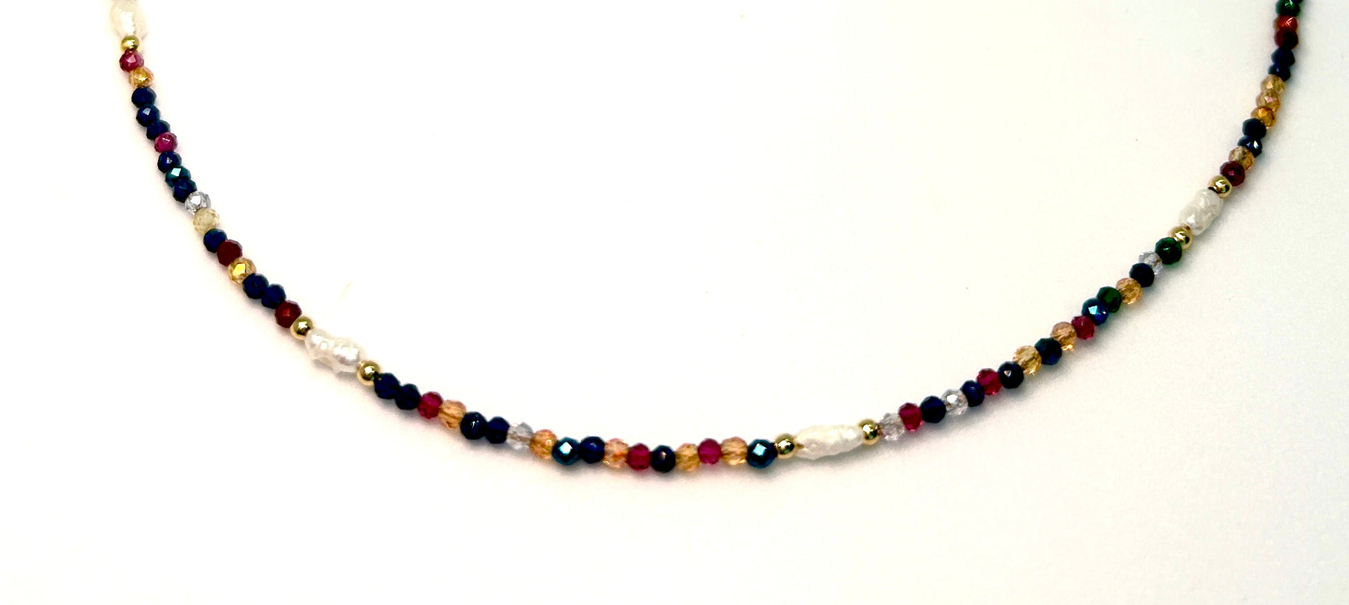 Bella y delicada gargantilla de cristales de colores de 2 mm y perlas. Medida 36 cm +7cm de extensión.