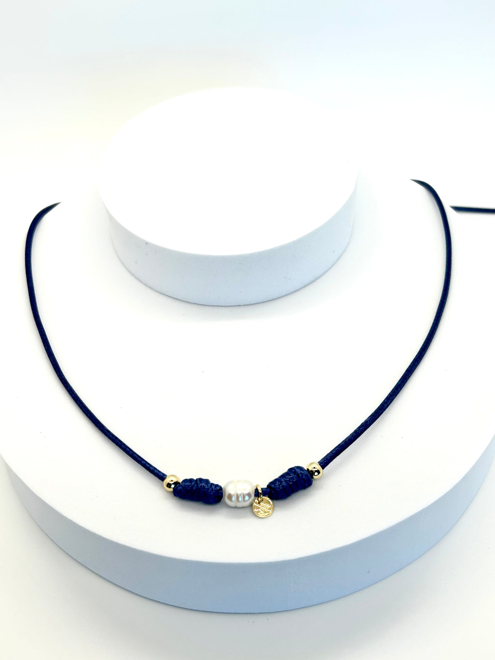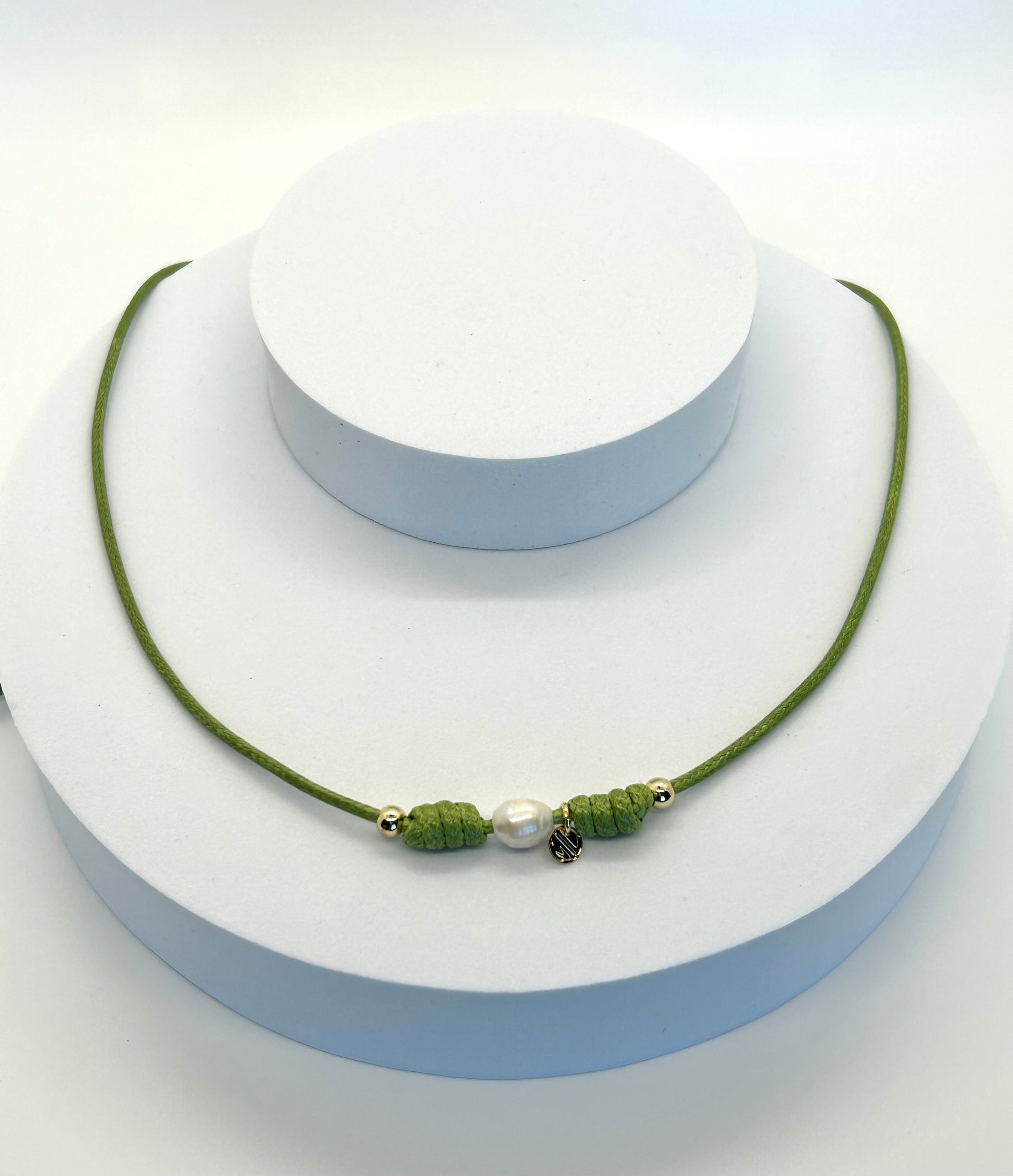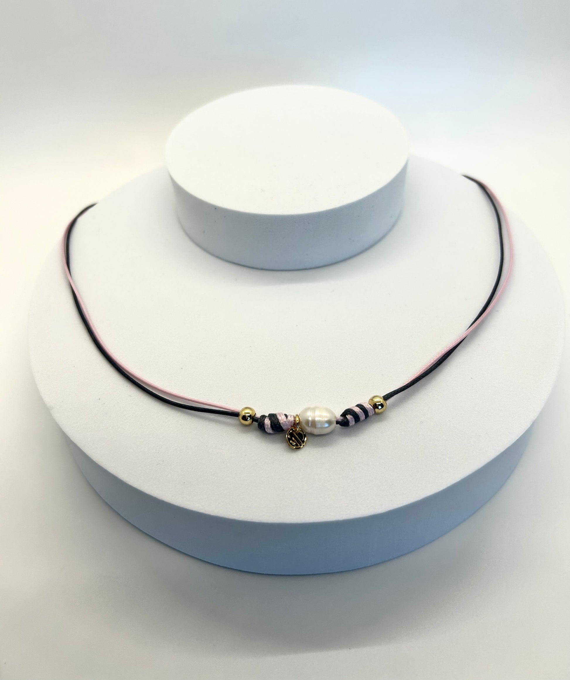 Bella y versátil gargantilla, ajustable con perla cultivada e hilo de piel de serpiente.