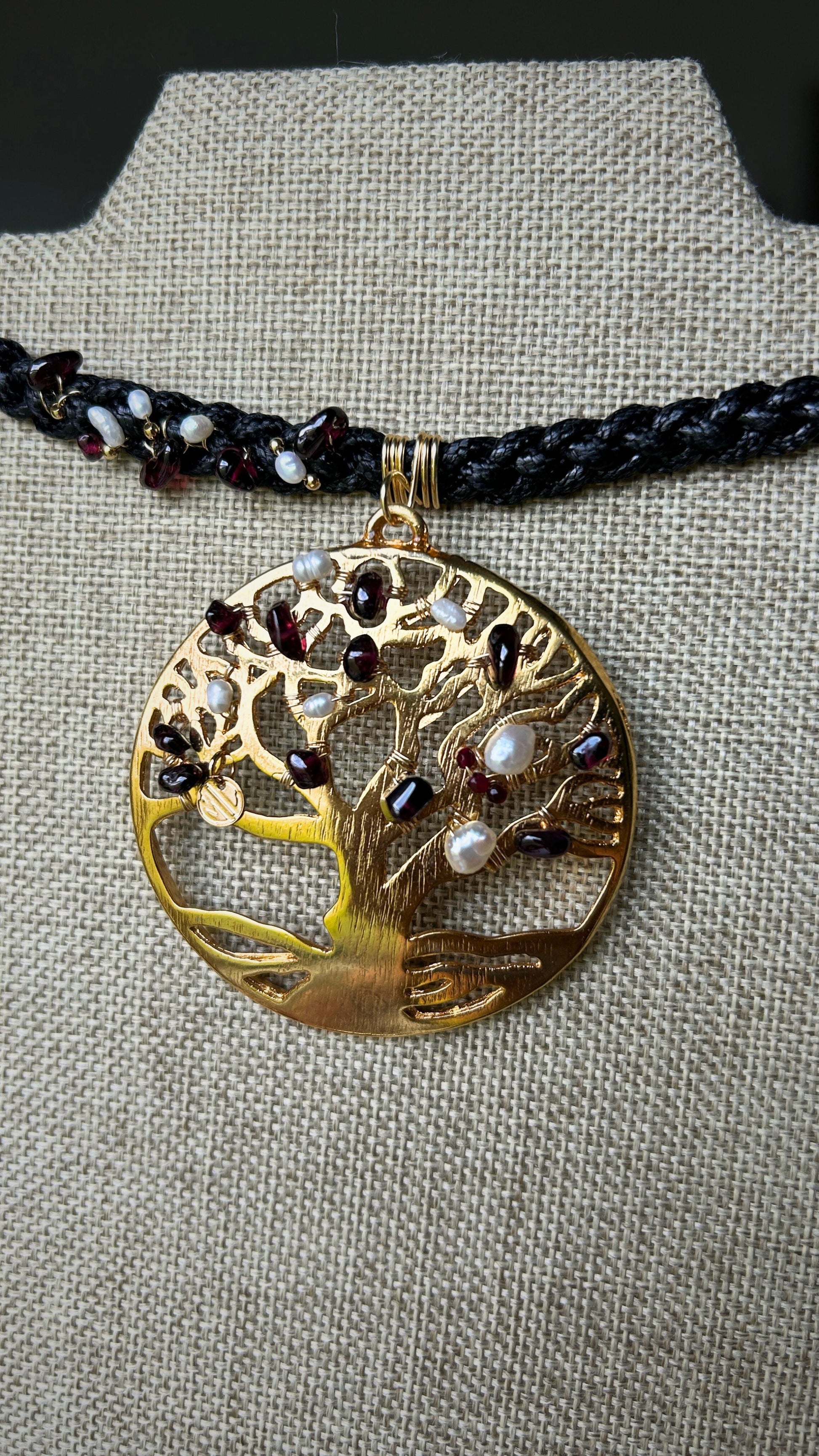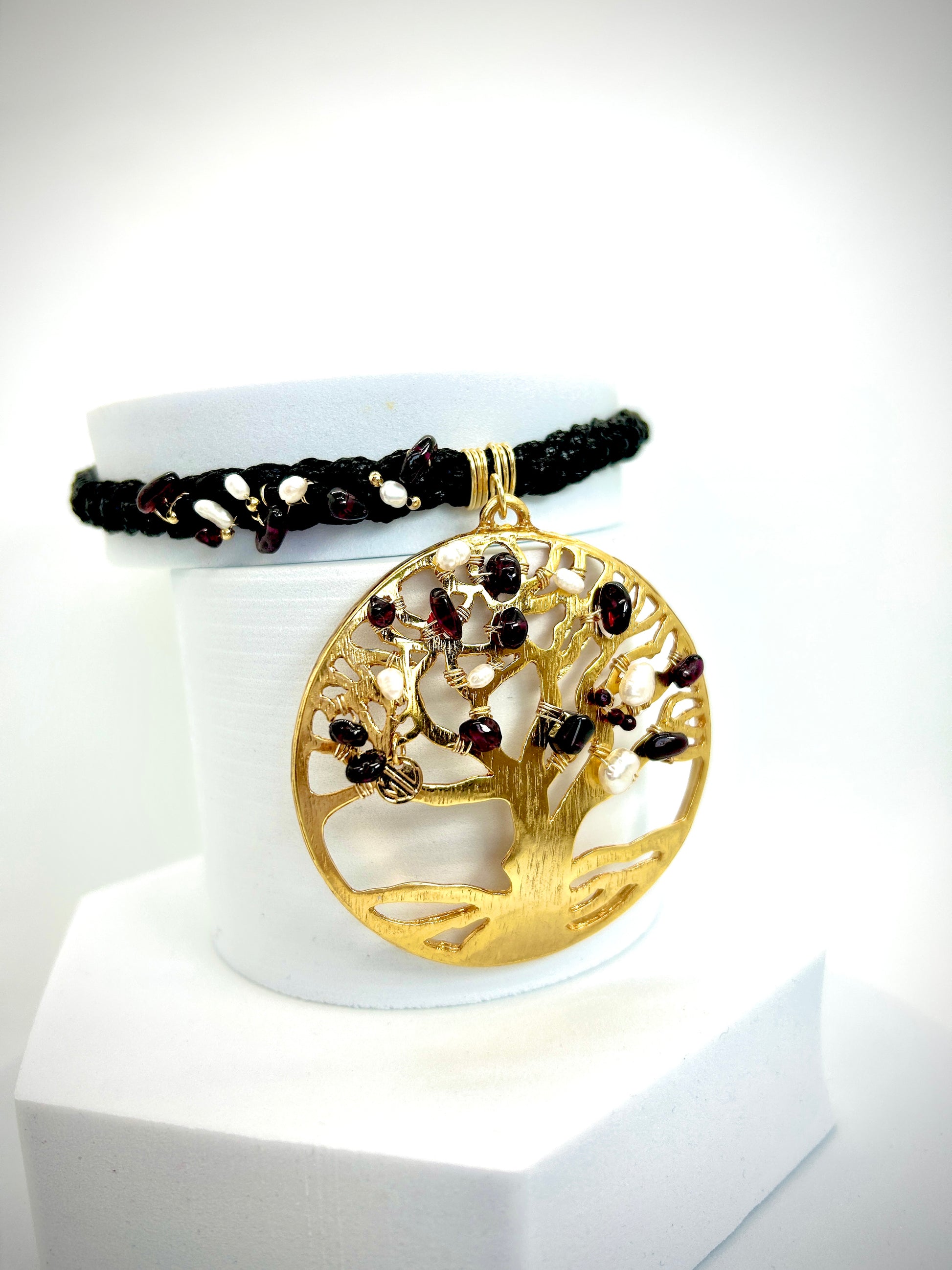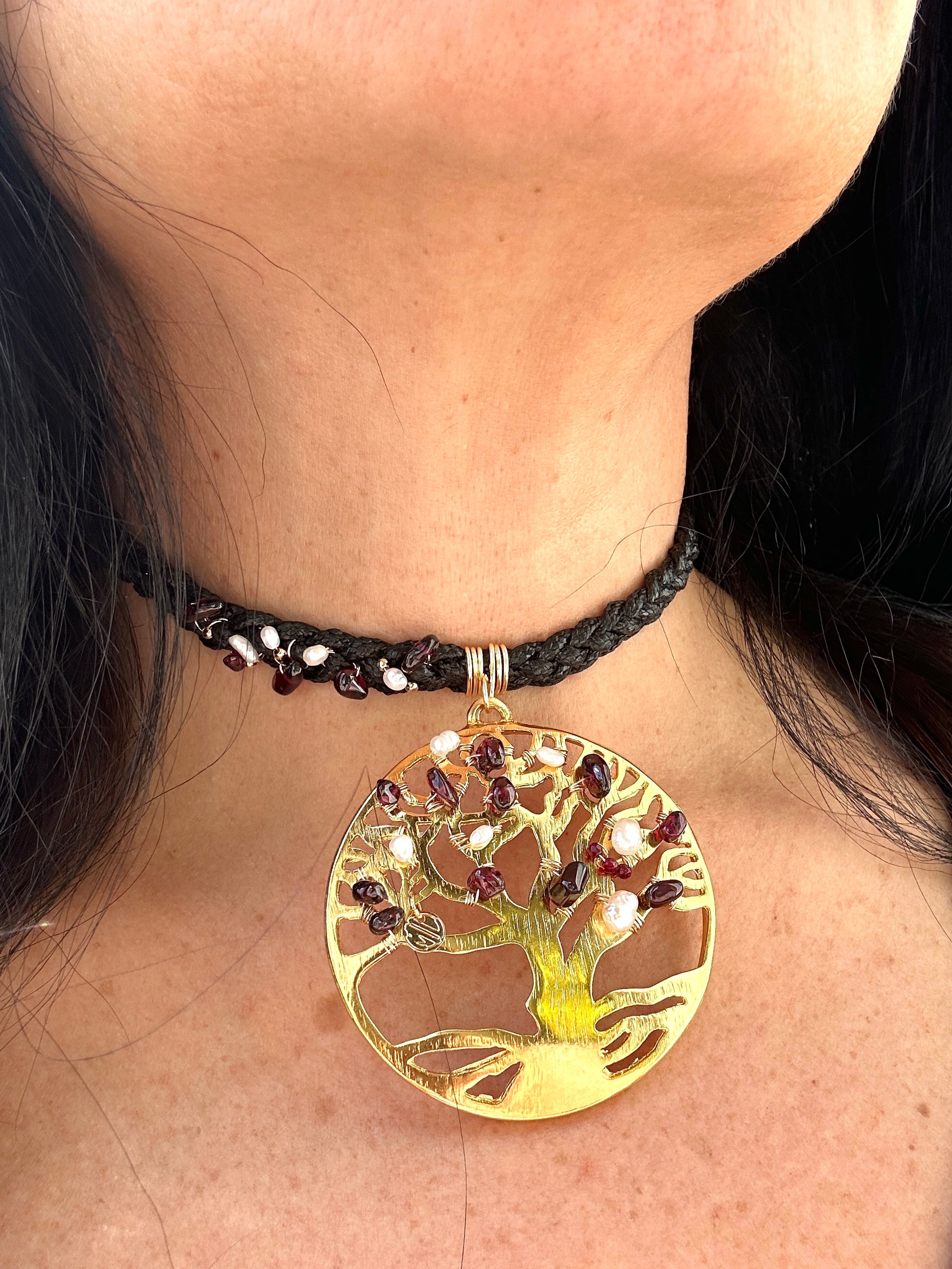 Bello y elegante cocker, elaborado con hilos de piel de serpiente trenzados, perlas y granates, con dije central de árbol de la vida engastado con perlas y granates en hilo de gold plated AAA hipoalergénico, al igual que el dije. Pieza única.